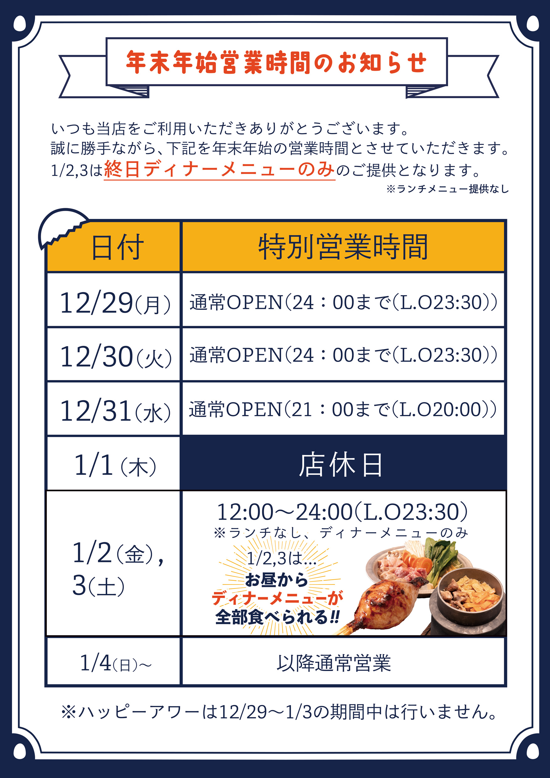 ※12/29-1/3の期間中、ハッピーアワーは行いません。